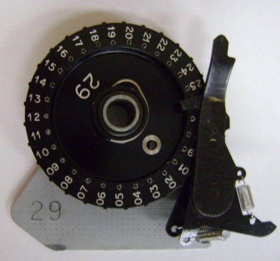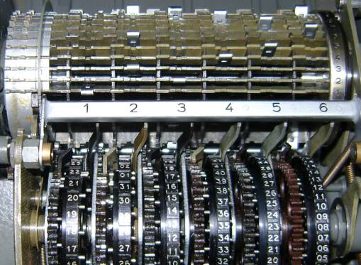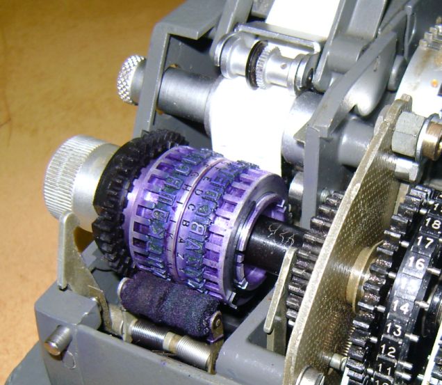 If a guide arm is in the active position (when the pin on the current wheel is set) [2] during the revolution of the drum all lugs on bars in that position will contact the active guide arm. Those bars are forced to slide to the left [3]. The left side of the drum works as a variable-toothed gear [4]. Each bar that is slid to the left is one more tooth on the drum. The drum will turn the gear from the printing wheel. Therefore, the number of steps that are added to the plain letter is the number of teeth on the drum. The C-52 produces a constant stepping of the wheels, each with its own prime number of pins, resulting in a very long period of different wheel position combinations. On the CX model the movement of the 6 wheels depends on the settings of the lugs on the drum and the pins on the wheels, which results in a complex stepping. If we number the wheels from left to right the first wheel steps on each cycle of the drum. The other 5 wheels are moved by 5 special advance bars. Each of these bars is identical to the encryption bars but it also has small fixed pins. If a lug on such a bar contacts an active guide arm it will be forced to slide to the left, just as a normal bar. However, in the case of advance bars a little fixed pin at that bar will now be positioned right in front of a small gear wheel, which steps the pinwheel one step further. On the photo from the drum (above) we can see two small movement pins on the left side of bar number 5. In the example below [5] we can see that the current pin on wheel 2 is in the active position, and on the drum the advance bar for wheel 5 has a lug in position 2. The moment the drum revolves, that lug will contact the guide arm from wheel 2, push the bar to the left and let the small fixed pin advance wheel 5. Both sender and receiver must set their machine in exactly the same way. The key setting consists of six parts. The selection and order of the pinwheels, adjusting the pins on the wheels, the lugs, the advance bar lugs, the print wheel offset and the message key or initial start position of the pinwheels before enciphering a message. On the C-52 model the operator first selects 6 wheels from a set of 12 different wheels. These can be placed in any desired order in the machine. On the CX-52 model all wheels have 47 pins. Extracting the wheels is done by opening the cover and pull out the main wheel axle to the right. The experts recommend that a statistically random method be used in choosing a pattern for setting the pins. A simple way is flipping a coin and writing down the result (obverse = active pin, reverse = inactive pin). For an even distribution you should never allow more than 3 successive pins on any wheel to have the same state and try to have close to 50 percent of the pins on a wheel in the active position.
