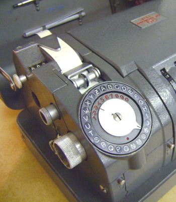 The Cipher or Decipher mode is selected with a knob on the left side. To encipher the operator turns the large letter knob on the left side until the desired letter appears on the letter dial and pushes the lever on the right side of the machine downwards. In Cipher mode the letters are printed in groups of five letters and the letter X is used to replace a space. In Decipher mode there are no groups and a deciphered letter X is replaced by a space. When the counter is reset, this also will reset the group counting of the printing mechanism. The unit can be attached to a separate electrical motorized keyboard. The combination of C-52 or CX-52 and B-52 electrical keyboard is called BC-52.