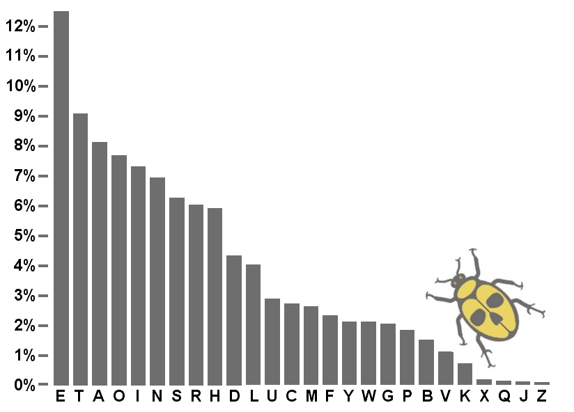 In the English frequency table below, the letters are sorted from most frequent left to least frequent right. Poe used an older and slightly different frequency table. However, frequency tables in any given language can differ, depending on subject, style and size of the text. Also, Poe did not use spaces, or a symbol for space, in his text. In plain text, the space occurs much more often than the letter E and would stand out clearly. To illustrate how distinctive letter frequency is, lets count how often certain letters occur on this webpage: E=1163 T=887 A=630 D=320 W=158 V=70 Z=10.