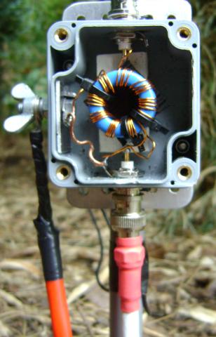 dicht mogelijk bij de ingang van de coax in de woning. Als de ontvanger een aparte aarding heeft, dan kan deze verbonden worden met de aardingsaansluiting op de box. Het is sterk aanbevolen om één enkel aardingspunt te gebruiken, de aparte delen van het antennesysteem aan dat ene aardingspunt aan te sluiten, elk met zijn eigen dikke koperkabel of een platte geweven aardingskabel en alle kabels zo kort als mogelijk te houden. WAARSCHUWING: dit is hoe de externe aansluiting van de antenne werkt bij mijn Sangean ATS 909X en bij enkele andere merken. Andere ontvangers hebben mogelijk een ander type stekker of andere bedrading van de stekker! Informeer jezelf over het correct aansluiten van een externe antenne op uw radio. Ik ben niet verantwoordelijk voor eventuele schade, veroorzaakt door verkeerd aansluiten van een antenne. Steek de 3,5 mm antennestekker nooit in een andere (audio) bus! De antennestekker en audiostekker zijn mechanisch identiek maar ik weet niet wat dit kan doen met je radio, aangezien de transformator uitgang LF en DC signalen virtueel kortsluit. Ik stak de antennestekker enkele keren per ongeluk in de audio uitgang van mijn 909X (dommerik) zonder enige schade, maar vermijd dit echter te allen tijde. Je kunt eventueel een flashy waarschuwingslabel aan de antennekabel bevestigen, vlak bij de stekker, aangezien onze hersenen geconditioneerd zijn om zulke 3,5 mm audio stekkers altijd weer in een audio bus te steken. Het eerste werk is de constructie van onze RF (Radio Frequentie) aarding. Zonder deze aarding kan de stroom niet door de primaire wikkeling van de transformator lopen. Eens deze aarding klaar is en we onze transformator gemaakt hebben kunnen we de eerste test uitvoeren met de antenne. De aarding is een 2,5 meter lange koperen buis met een diameter van zo'n 20 mm, zoals je deze vindt in je lokale zelfbouwmarkt (gebruik blank koperen buis!). Als je het materiaal en geld hebt mag je langere buizen gebruiken met een grotere diameter. Kies voor de aarding een plaats waar regen gemakkelijk in de grond kan dringen. Tracht plaatsen te vermijden waar beton, grote planten of bomen staan, omdat deze het grootste deel van het water absorberen en de grond hierdoor niet genoeg zal geleiden voor het antennesysteem. Je kunt eventueel de grond een beetje laten aflopen naar de aardingsbuis toe, om het regenwater er naartoe te leiden. De aardingbuis wordt 2,5 meter diep in de grond gedreven. Probeer dit niet te doen met een hamer (en de buis uiteindelijk te plooien). Er is een veel eenvoudigere methode met waterkracht! Neem een stuk plastic darm waarvan één kant verbonden is met een standaard tuinslangkoppeling en de andere kant over de koperbuis geschoven en met een spanring vastgemaakt. Sluit het geheel aan op de tuinslang, open de waterkraan en duw het einde van de koperbuis (waar het water uit sproeit) in de grond. Door de waterdruk zal de buis met weinig moeite in de grond zakken. Oh, en draag laarzen of slippers want het wordt nogal nat! Ik slaagde erin om mijn koperen buizen volledig in de grond te drijven in minder dan twee minuten! Ik kwam een kleilaag tegen maar met wat porren kwam ik daar zonder problemen door. Je zult verbaasd zijn hoe snel het gaat! Gebruik aardingskabel (platte geweven koperen batterij kabel) of verschillende getwiste dikke koperen draden om de koperen buis op het antennesysteem aan te sluiten. Verbind de aardingskabel met een speciale elektrische aardingsklem met de koperen buis of wikkel de kabel verschillende keren rond de buis en soldeer deze met een grote soldeerbout of gasbranden stevig aan de buis. Dicht de verbinding met dichtingsmiddel en/of krimpkous om de verbinding waterdicht te maken. BELANGRIJKE VEILIGHEIDSWAARSCHUWING: gebruik NOOIT de aarding van de elektrische installatie of een 220V stekker in de woning als RF aarding. Dit is zowel idioot gevaarlijk en de slechtste RF aarding die er is, vol van stoorsignalen. Als je geen geschikte grond hebt om de koperen buis in te steken kan je overwegen om koperen draad-radialen horizontaal in de bovengrond of aan te oppervlakte te leggen. Deze koperdraden moeten onder de antenne lopen en dienen als virtuele aarde. Op het internet vind je verdere info over RF radialen. De belangrijkste functie van de 9:1 transformator (dit type wordt ook Unun of unbalanced to unbalanced genoemd) is het verlagen van de zeer hoge impedantie, typisch voor een end-fed longwire, naar een lage impedantie, geschikt voor de ontvanger. Een interessante eigenschap van dit type transformator is dat de primaire winding recht naar de aarding gaat waardoor de opbouw van statische energie in de antenne onmogelijk is. Je kunt zulke Unun transformators kopen, maar die kosten algauw meer dan 30 Euro en de meesten hebben - helaas - geen aparte aansluiting voor de aarding. Voor enkel ontvangstdoeleinden kan je zo'n transformator maken voor minder dan 5 Euro. Het duurste onderdeel is waarschijnlijk de behuizing. Ik gebruikte een professionele box, maar je kan net zo goed een pillendoosje of een kort stuk PVC waterbuis met twee stops gebruiken. Zorg er wel voor dat alles waterdicht is. Er zijn genoeg DIY constructievoorbeelden voor Unun's te vinden op het internet. Zelf een transformator maken klinkt erger dan het is. Eerst dien je een geschikte ferriet ringkern te vinden. Voor ontvangstdoeleinden zijn het materiaal van de kern, afmeting en wikkelingen veel minder kritisch dan voor zenden. Je kunt zulke ringkernen (geschikt voor HF transformators) in goede elektronicawinkels of op het Internet vinden. Als je echt, echt, geen ringkern te pakken krijgt, kan je de ferrietstaaf uit een oude radio slopen. Dit zal ook werken als transformator maar je zult dan moeten experimenteren met de wikkelingen. Ringkernen zijn echter betere transformators die ook immuun zijn voor elektromagnetische storing vanwege hun ronde cirkelvorm. Hier in Europa verkoopt Conrad