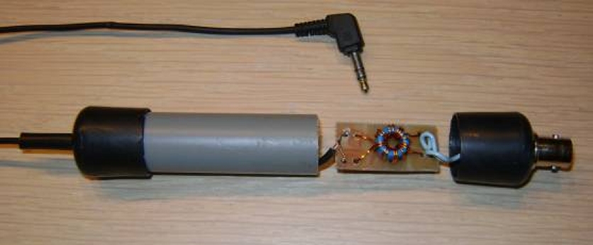 artikel 500671 Ik gebruikte een klein stuk 5/8 PVC buis met twee stoppen om de kleine ringkern in te stoppen. Klein, slank en licht. Eén kant (maakt niet uit welke) is verbonden met de BNC connector. Aan de andere kant dien je een trekontlasting te maken (bvb met enkele straps binnenin) om te vermijden dat aan de gesoldeerde aansluitingen wordt getrokken. De tweede transformator is verbonden met de 3,5 mm stekker voor de externe antenne-aansluiting. Soldeer één draad van de secundaire wikkeling (het maakt niet uit welke) aan de tip van de stekker en de ander aan de massa van de stekker. Je kunt gewone audiokabel gebruiken voor dat laatste stuk tot aan de stekker aangezien de gebalanceerde lijn geen storing oppikt. De kabel tussen transformator en ontvanger mag tot een metertje lang zijn. Indien beschikbaar, gebruik je best een haakse 3,5 mm stekker omdat die de bus van je ontvanger minder belast. Tip: een stekker met de audiokabel er al aan bevestigd (van een oude hoofdtelefoon of zo) is eenvoudig en steviger dan een zelf gesoldeerde stekker. WAARSCHUWING: nogmaals, dit is hoe de externe aansluiting van de antenne werkt bij mijn Sangean ATS 909X en bij enkele andere merken. Ander ontvangers hebben mogelijk een ander type stekker of andere bedrading van de stekker! Informeer jezelf over het correct aansluiten van een externe antenne op uw radio. Ik ben niet verantwoordelijk voor eventuele schade, veroorzaakt door verkeerd aansluiten van een antenne.