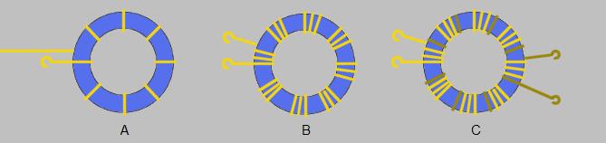 Electronics de 26 mm ringkernen artikel 500671 We hebben 24 wikkelingen nodig voor de primaire (grote) wikkeling, verdeeld over drie maal 8 windingen. Wikkel de draad dicht tegen de kern en verdeel de 8 wikkelingen over de hele omtrek van de kern (zie A). Plooi de draad goed rond de randen van de kern om hem dicht bij de kern te houden. Ga voorbij het startpunt van de draad en wikkel een tweede reeks van 8 wikkelingen, net naast de vorige acht wikkelingen, en wikkel tenslotte een derde reeks van 8 wikkeling, weerom tegen de vorige wikkelingen aan (het resultaat moet eruitzien als B). De secundaire (kleine) wikkeling bestaat slechts uit 8 wikkelingen. Je start aan de tegenovergestelde kant van de ringkern en wikkelt de 8 wikkelingen netjes naast de primaire wikkeling over de volledige kern (zie C) totdat je terug aan de tegenovergestelde kant komt. Sommigen wikkelen deze zogenaamde quadfilar ringkernen met vier afzonderlijke draden tegelijk waarna de afzonderlijke delen samen gesoldeerd worden. Voor zulke kleine ringkernen vind ik het persoonlijk gemakkelijker om één draad per winding te gebruiken. Een goede raad: start met een koperdraad die lang genoeg is! Klaar? Proficiat, je hebt net een quadfilar 9:1 transformator gemaakt. Niet zo moeilijk. Vergeet niet de primaire en secundaire wikkelingen te merken zodat je ze niet verwisselt! Nu dat je eerste gestreepte donut klaar is, en voor hem in de behuizing te monteren, kan je best al eens snel testen. Soldeer één draad van de primaire (grote) wikkeling, één draad van de secondaire (kleine) wikkeling en twee testdraden tezamen (schraap het email eraf alvorens te solderen). Eén van de testdraden gaat naar de aarding en één wordt gesoldeerd aan de massa van een 3,5 mm stekker. De vrije draad van de primaire wikkeling gaat naar de antenne en de vrije draad van de secondaire wikkeling gaat naar de tip van de 3,5 mm stekker. Hang de draadantenne buiten op, steek de antennestekker in de externe antenne bus van de ontvanger en test alle HF banden eens uit. Normaal zullen de 24 en 8 wikkelingen op de ringkern alle HF banden goed afstemmen. Indien echt noodzakelijk kan je het aantal wikkelingen aanpassen (hiervoor moet je alles opnieuw wikkelen!) met meer wikkelingen om de lagere frequenties te benadrukken en minder wikkelingen voor de hogere frequenties. Behoud wel de 3 op 1 verhouding tussen primair en secundair (dit geeft een 9:1 transformatie). Als je tevreden bent met het resultaat kan je alles terug los solderen en de ringkern in een waterdichte box monteren. Soldeer de ringkern aansluitingen aan de connectoren (soldeervet maakt het gemakkelijker): soldeer één draad van de primaire wikkeling één draad van de secundaire wikkeling en de massa (chassis) van een BNC connector allemaal samen met de aansluiting voor de aardingsbout. De tweede draad van de primaire wikkeling gaat naar de antennebout en de tweede draad van de secundaire wikkeling soldeer je aan de pin van de BNC connector.