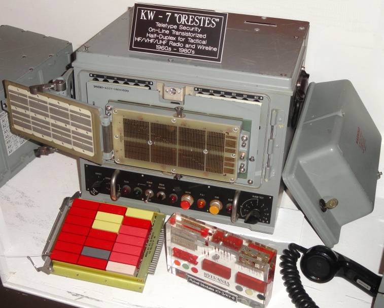 regelgeving In 1956, na tevergeefs geploeter met filters en afscherming, kwam het Navy Research Laboratory met de eerste doorbraak in signaalonderdrukking door simpelweg de oorzaak van de signalen te beperken. Het gebruikt van elektronische componenten en halfgeleiders op veel lagere spanning veroorzaakten veel minder ongewenste straling dan de gebruikelijke elektromechanische systemen. Een signaal met een amplitude van 2 volt reikt natuurlijk veel minder ver dan een signaal van 120 volt, en het schakelen met transistoren vermijdt het vonken van relaiscontacten. NSA nam de techniek van filteren en lagere spanning over voor al hun nieuwe one-time tape mixers. De 800 meter straling werd teruggebracht tot minder dan 6 meter. Alle nieuwe apparatuur zoals teleprinters en crypto-machines werden nu ontworpen met de opgedane kennis. In 1958 werden uitgebreide TEMPEST voorschriften opgesteld door de Military Communications Board (MCB). De classificatie van de verschillende problemen werd eindelijk gespecificeerd en algemeen erkend. In 1959 volgden Canada en het Verenigd Koninkrijk en datzelfde jaar werd het eerste echte COMSEC (Communications Security) plan geschreven en richtlijnen op papier gezet. De gevolgen bleven niet uit. Dankzij de nieuwe richtlijnen werden vele onveilige situaties, apparaten en gebouwen geïdentificeerd. De noodzakelijke testen en keuringsnormen voor apparaten volgden al snel. In 1966 werden de voorschriften eindelijk ingevoerd en in 1970 werd het TEMPEST laboratorium voor non-crypto apparatuur opgericht. Rechts ziet u een mooi voorbeeld van TEMPEST design uit midden jaren '60. De KW-7, een tweede generatie teletype encryptie unit, was volledig gefilterd en afgeschermd, en werkte met elektronica op lage voltage. Voor de machine links ligt één van zijn 12 kaarten met daarop 21 modules. Elke module bevatte verschillende transistoren en passieve componenten. Deze kleine "Flyball" modules waren de voorloper van de hedendaagse geïntegreerde circuits of IC's. De KW-7 was een hele verbetering tegenover de 131-B2 met zijn houten kabinet. De technische verbeteringen en voorschriften kwamen niets te vroeg, want in de vroege jaren 50 hadden de Sovjets al een uitgebreide set van voorschriften voor onderdrukking van ongewenste signalen gepubliceerd voor teleprinters en andere communicatieapparatuur, veel strenger dan de gebruikelijk normen in de industrie. Zij waren terecht ongerust en erkenden de gevaren én de kansen van ongewilde straling al zeer vroeg. Of zij de communicatie van de toen onwetende tegenstanders ook onderschepten blijft verborgen in de Sovjet inlichtingenarchieven. Sindsdien is TEMPEST niet meer weg te denken in de wereld van veilige communicatie en worden de regels van de kunst toegepast op ontelbare apparaten. Het grootste TEMPEST object is ongetwijfeld het enorme NSA gebouw in Fort Meade dat volledig in koper werd afgeschermd. Vandaag valt TEMPEST onder het bredere EMSEC of Emission Security. De moderne elektronica biedt nieuwe mogelijkheden om ongewenste straling te onderdrukken maar maakt ook de ontwikkeling van gesofistikeerde en zeer gevoelige apparaten mogelijk voor het onderscheppen van zwakke signalen. Het ontwikkelen en gebruik van veilige communicatiemiddelen blijft tot op vandaag een technische uitdaging.